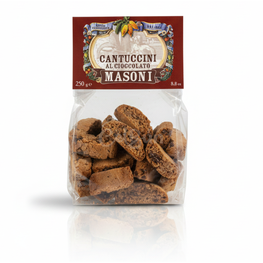 Pentru iubitorii de ciocolată, Cantuccini al Cioccolato Masoni este reinterpretarea decadentă a clasicului biscuit toscan. Rețeta păstrează textura crocantă și coacerea dublă (specifică biscotti), dar înlocuiește migdalele întregi cu o cantitate generoasă de bucăți de ciocolată de înaltă calitate (15% din compoziție, cu minim 28% cacao).