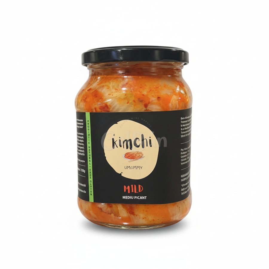 Etichete: kimchi mediu picant, varză chinezească, fermentat natural, probiotice, nepasteurizat, gust echilibrat, sănătate digestivă, tradițional coreean, ardei iute moderat