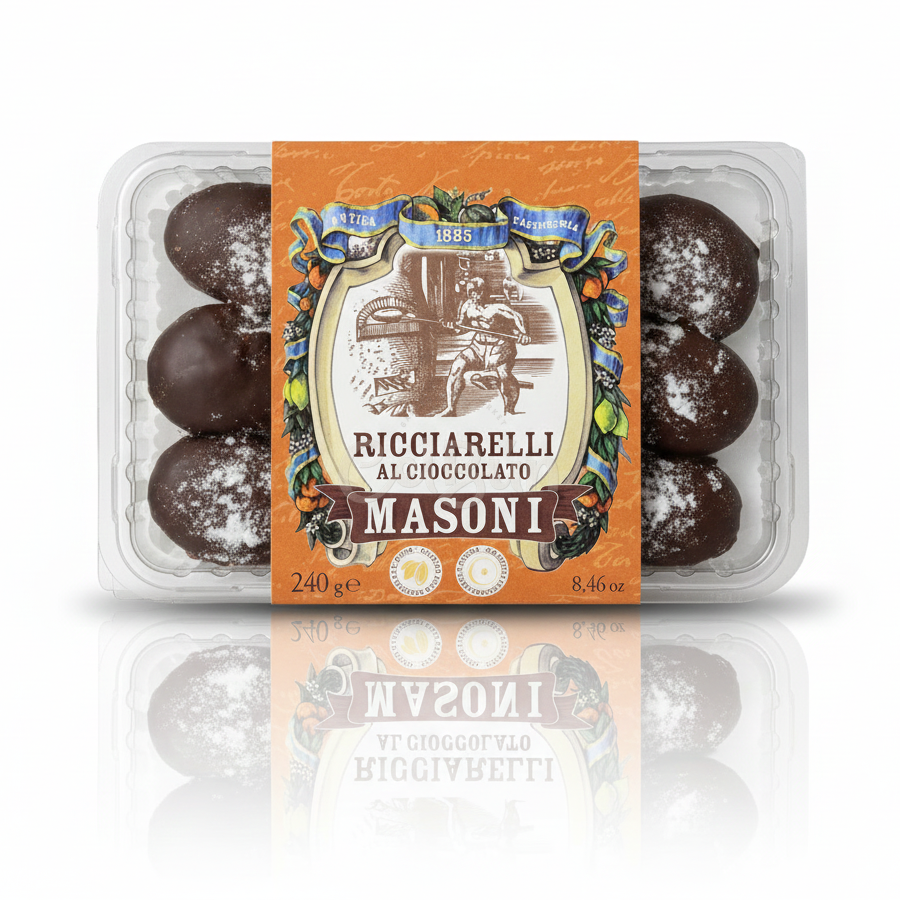 O specialitate cu adevărat decadentă! Ricciarelli al Cioccolato Masoni combină dulceața tradițională și textura moale a biscuiților Ricciarelli cu intensitatea și amărăciunea rafinată a ciocolatei negre.